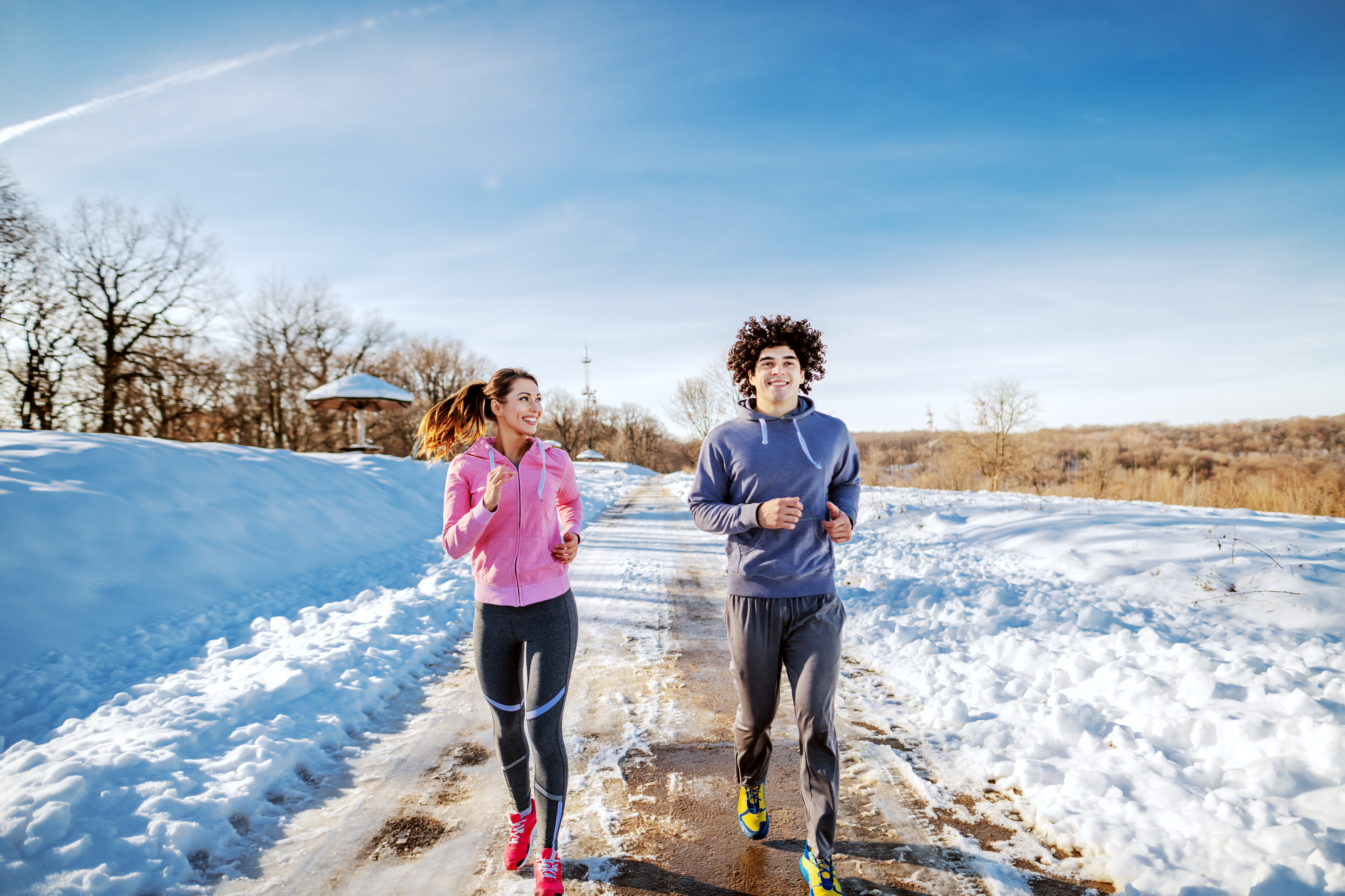 As we see flakes of snow falling and temperatures below freezing, it is a good time to discuss strategies for running outside safely. First, make sure to dress appropriately for the weather. Wearing multiple layers will help to retain body heat and keep you comfortable in the cold. Begin with more clothing than you think you’ll need. You can always take a top layer or your gloves off if you feel you are getting too warm. You can’t add layers if you leave the house without enough on to begin with.